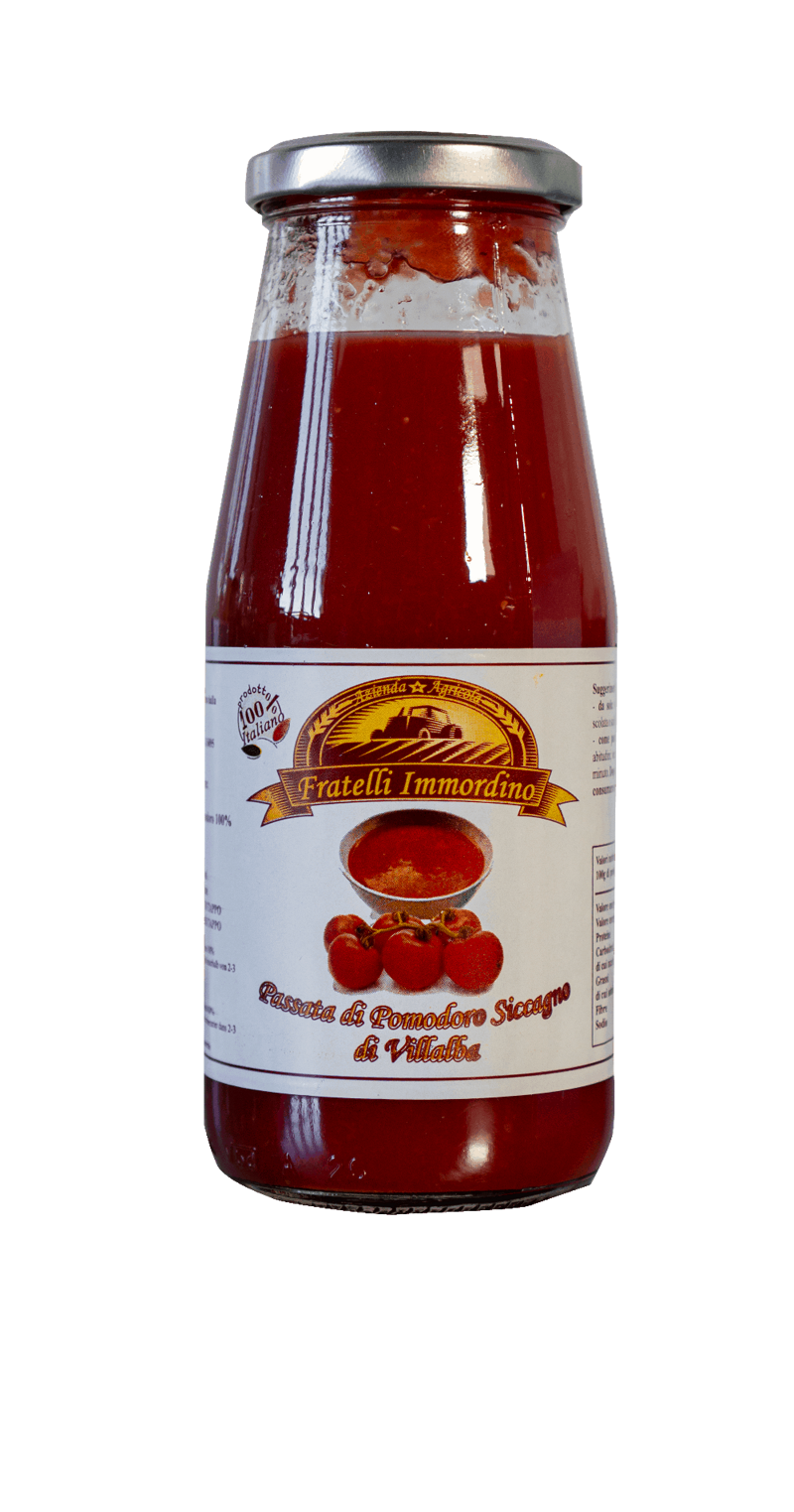 La nostra passata di pomodoro siccagno di Villalba è un condimento ricco e denso per paste eccezionali dal gusto deciso. Il pomodoro siccagno è un pomodoro unico nel suo genere. E quando diciamo “unico” non lo facciamo a caso perchè viene coltivato soltanto nelle colline delle valle del Belice. Il pomodoro siccagno è molto saporito tanto che la passata può essere cucinata anche senza sale. Ha un sapore profondo e intenso, che tuttavia non sovrasta il palato ma lo arricchisce di un’esperienza nuova. Qual è il risultato? Un prodotto unico sotto ogni profilo: bassa acidità, alto valore di residuo secco, una densità eccellente. I pomodori freschi, raccolti a mano,vengono lavati e, in fase di lavaggio, viene effettuata una cernita manuale. A questo punto, i pomodori sani, maturi e di buona consistenza vengono scottati in acqua bollente,triturati a crudo e in questa fase avviene anche la separazione delle bucce dalla polpa. La fase successiva prevede che il triturato di polpa di pomodoro venga ristretto sino a raggiungere il grado brix desiderato. Infine, il prodotto così ottenuto viene imbottigliato e pastorizzato.